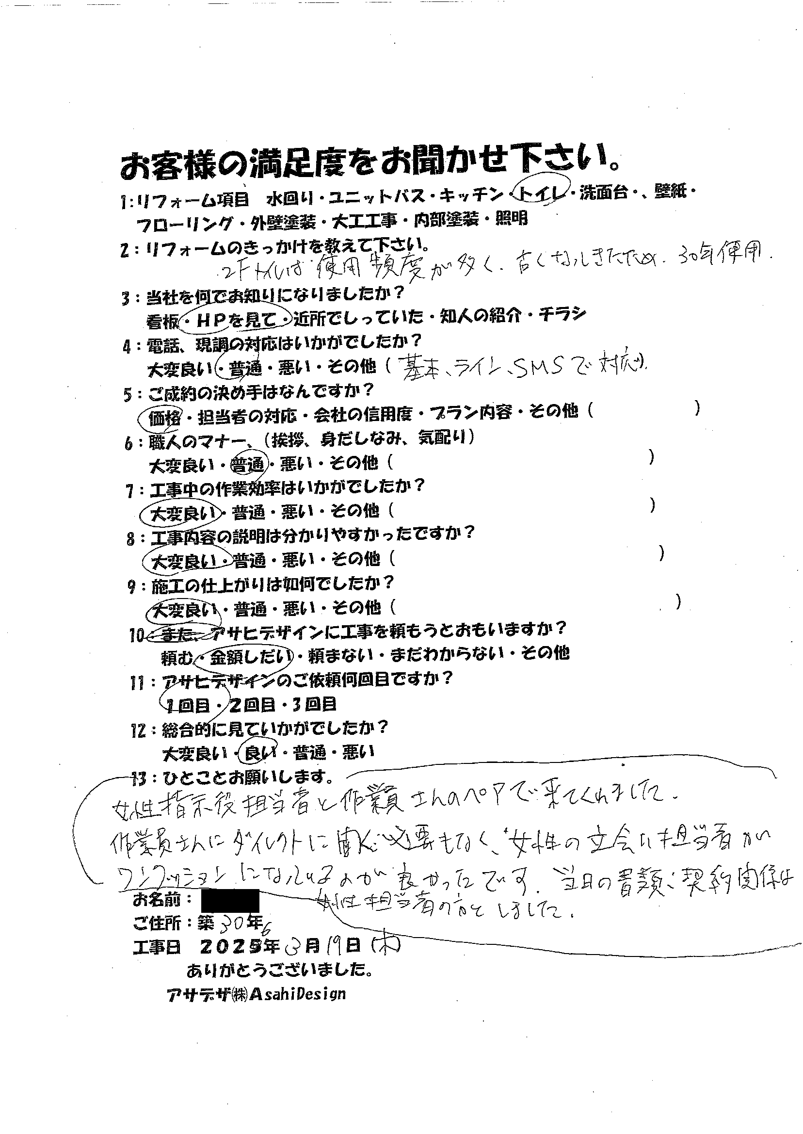 | 電話、現地調査の対応はいかがでしたか? | 普通 お客様コメント:基本ラインSMSで対応 |