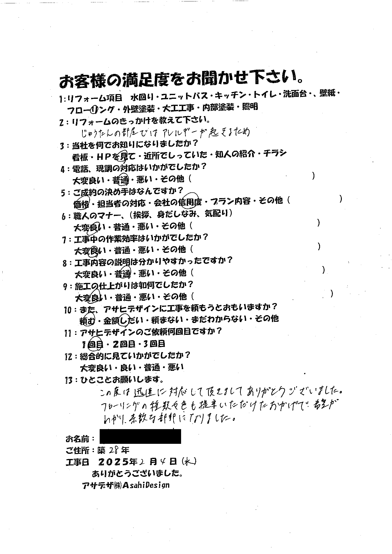 | ひとことください | この度は迅速に対応して頂きましてありがとうございました。 フローリングの種類や色も提案して頂けたおかげでがわかり、素敵な部屋になりました。 |