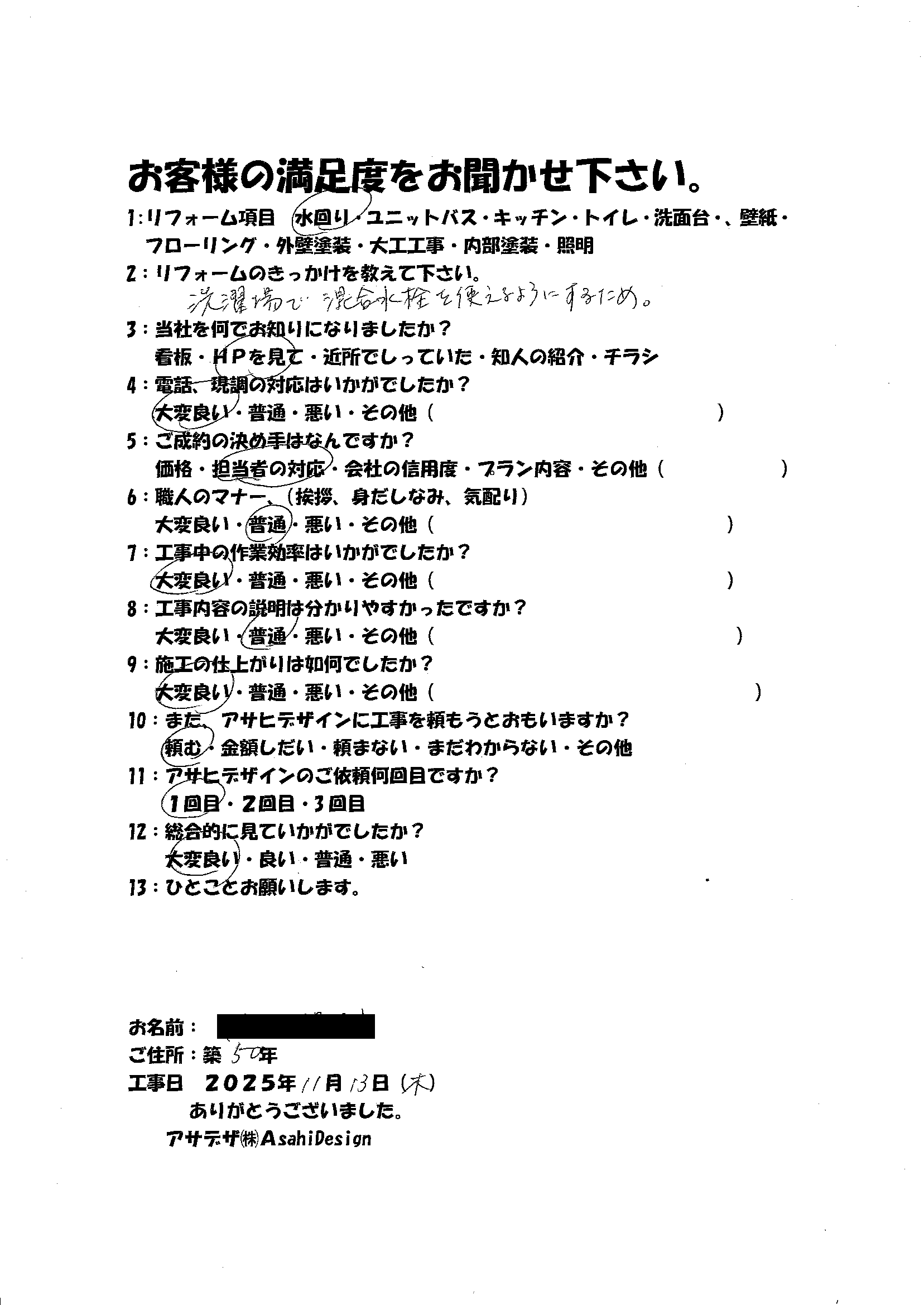川崎市麻生区Nさま洗濯水栓工事のお客様の声施工後アンケート